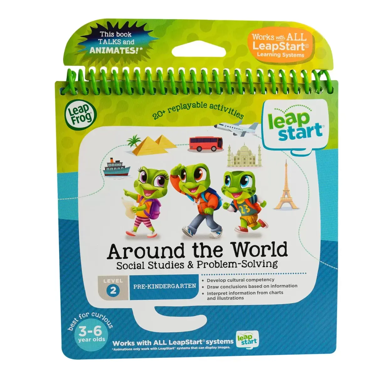 Join Leap, Tad and Lily as they travel to places like Egypt, France, India and Australia in the Around the World book for LeapStart systems. Play problem-solving games with the frogs and learn about logic, reasoning and social studies concepts. Tap the pictures and words on every page with the LeapStart stylus to magically bring the activity book to life. Enhance the learning with amazing animations when you play on a LeapStart system with a screen. Visit different countries and explore exciting landmarks while learning about the culture of those countries. Play a memory game to find photographs, decipher messages that use pictures to represent words and discover musical instruments from around the world. Many activities are designed with two levels so kids can play and learn at the right level and move up when they?re ready. This book is compatible with all LeapStart interactive learning systems. A computer with internet is required to download books onto the LeapStart system. Intended for ages 3-6 years. Batteries not required.